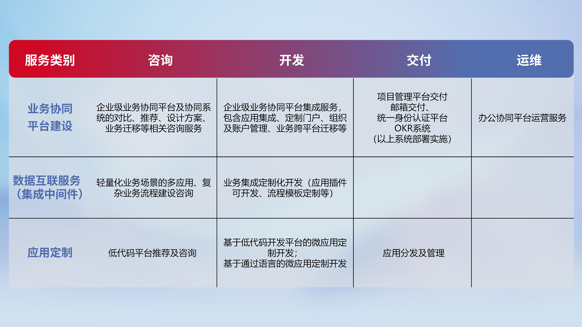 针对钉钉、、企微、、、、IDaas等平台级产品提供产品的规划、、、、方案、、、、交付、、、、定制化开发等服务,,,,实现如统一协同办公、、、、智能客户服务、、混合会议管理、、、、智能数据查询、、等业务场景,,,实现数字化转型。。。。